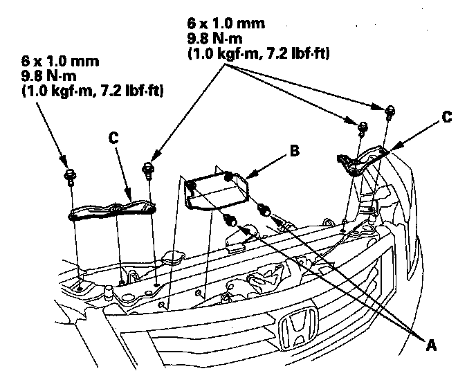 7. Remove the bolts, then remove the A/C condenser upper mount brackets (B). Remove the A/C condenser (C) by lifting it up. Be careful not to damage the radiator or condenser fins when removing the A/C condenser.