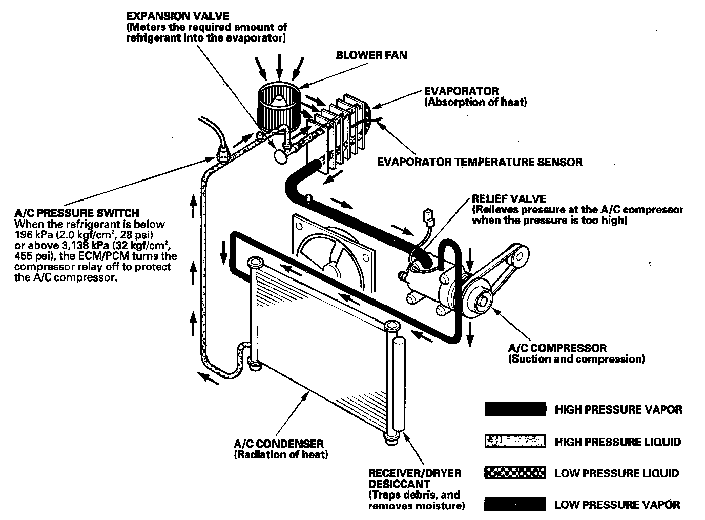 System DescriptionThe air conditioning system removes heat from the passenger compartment by transferring heat from the ambient air to the evaporator. The evaporator cools the air with the refrigerant that is circulating through the evaporator. The refrigerant expands in the evaporator, and the evaporator becomes very cold and absorbs the heat from the ambient air. The blower fan pushes air across the evaporator where the heat is absorbed, and then it blows the cool air into the passenger compartment.