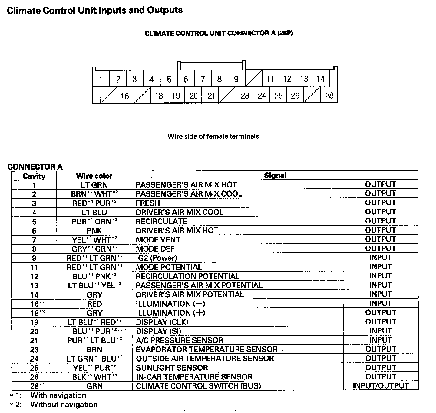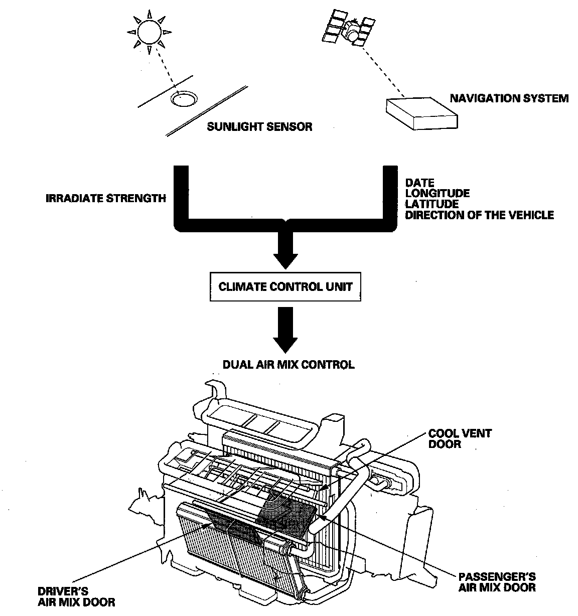 This system automatically controls the temperature and the vent mode of the air direction to the driver and passenger's side depending on the angle of the sun and the direction of the vehicle. It calculates information such as date, time, longitude, and latitude from the navigation system, as well as the irradiate strength of the sun from the sunlight sensor, to determine the appropriate mode position and temperature to be directed to each side.