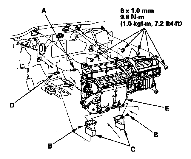 7. Disconnect the connector (A). Remove the clips (B), ducts (C), and the drain hose (D). Then remove the mounting bolt, mounting nuts, and the blower-heater unit (E).