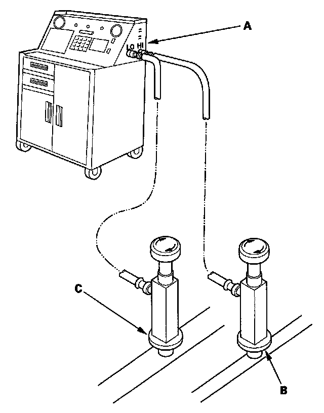 1. Connect an R-134a refrigerant recovery/recycling/charging station (A) to the high-pressure service port (B) and the low-pressure service port (C), as shown, following the equipment manufacturer's instructions.