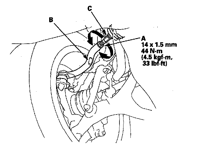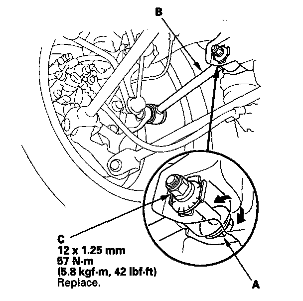 3. Hold the adjusting bolt (A) on the rear control arm (B), and loosen the self-locking nut (C).