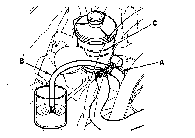 1. Remove the reservoir from its holder. Raise the reservoir, then disconnect the return hose (A) to drain the reservoir. Take care not to spill the fluid on the vehicle. Wipe off any spilled fluid at once.