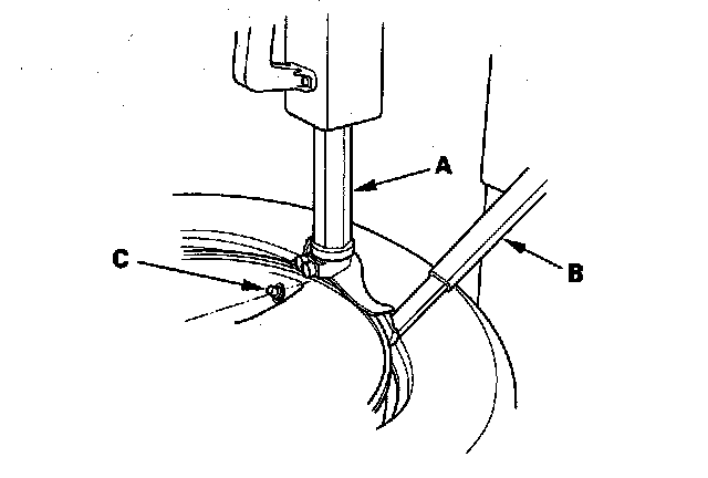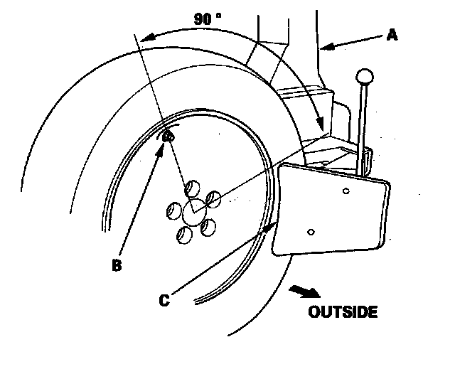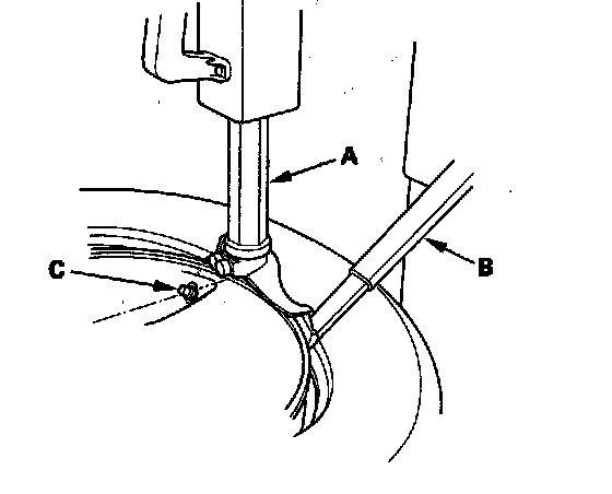 5. Position the wheel so the tire machine (A) and tire iron (B) are next to the valve stem (C) and will move away from it when the machine starts. Then remove the tire from the wheel.