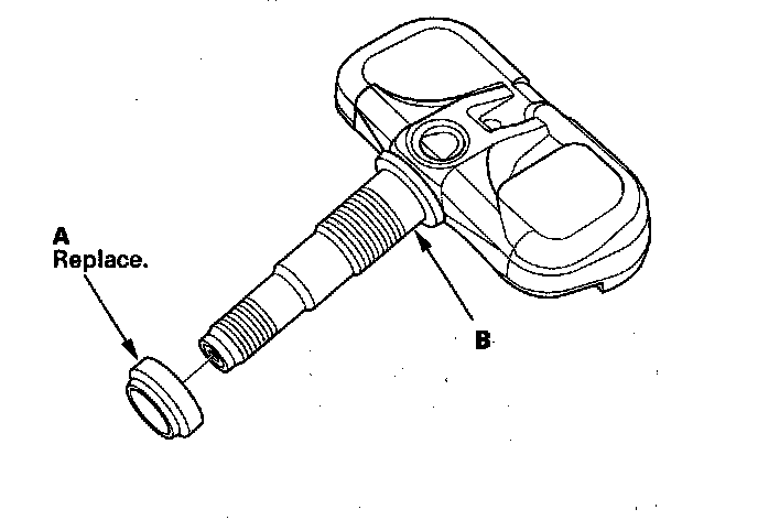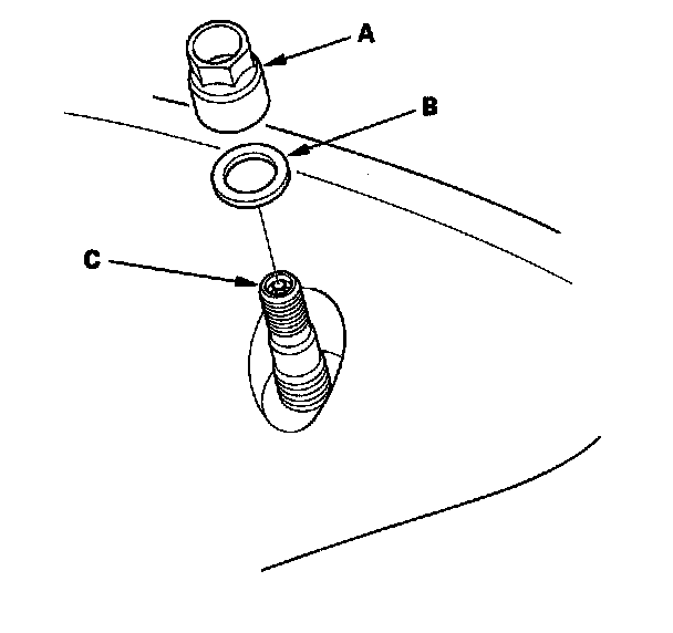 6. Remove the valve stem nut (A) and washer (B), then remove the tire pressure sensor with valve stem (C) from the wheel.