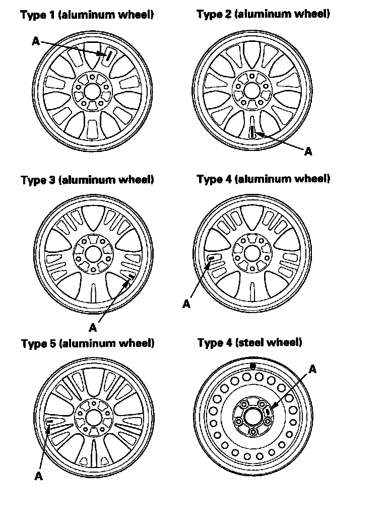 ^ Use only wheels that have a "TPMS", "TA0", or "TE0" stamp (A) on the inside of the aluminum wheels, and the outside of the steel wheels.