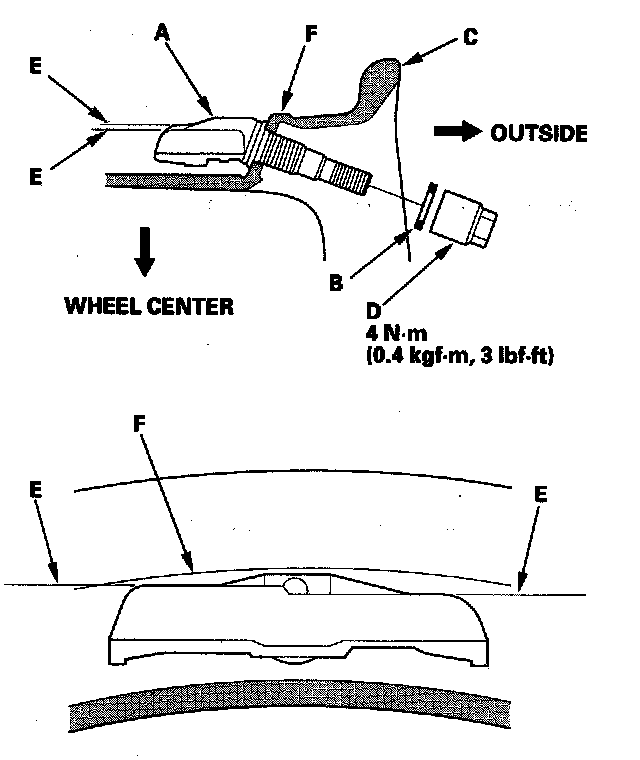 NOTE: Install the tire pressure sensor so that the sensor housing surface (E) does not extend beyond the protrusion (F) on the wheel to prevent the sensor housing caught to the bead of the tire when assemble the tire.