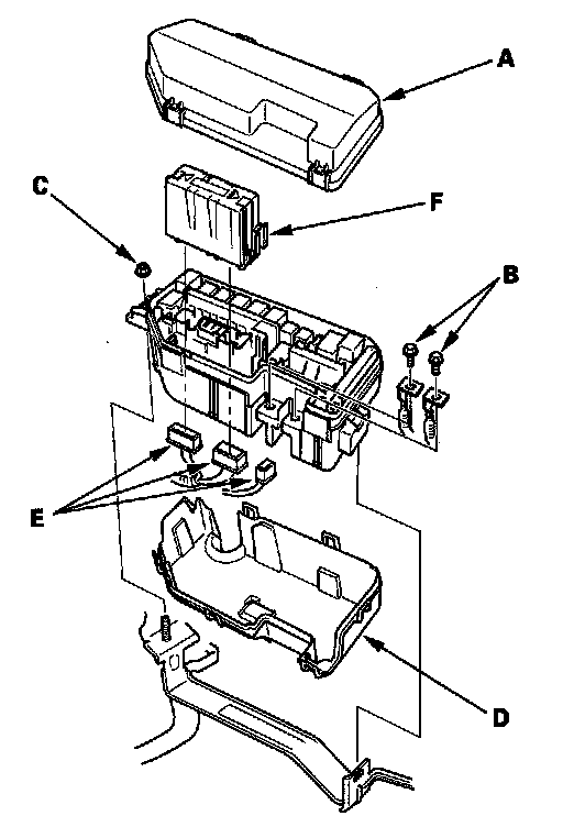 5. Remove the relay circuit board (F) from the under-hood fuse/relay box.