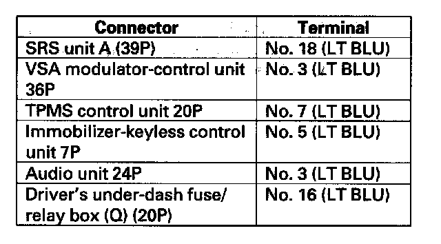 NO - Repair short in the wire between the DLC (K-line) and the VSA modulator-control unit, the SRS unit, the TPMS control unit, the immobilizer-keyless control unit, the audio unit, or the driver's under-dash fuse/relay box.