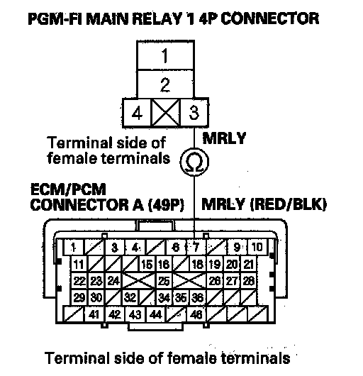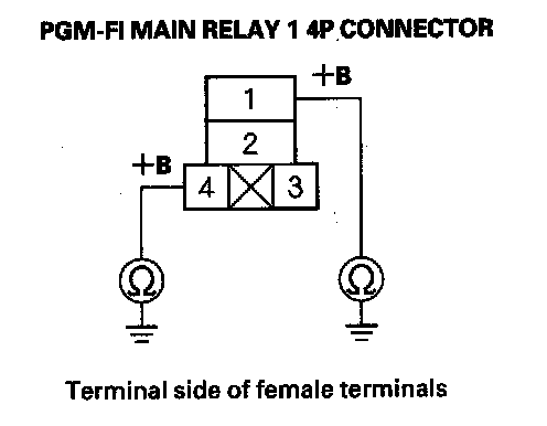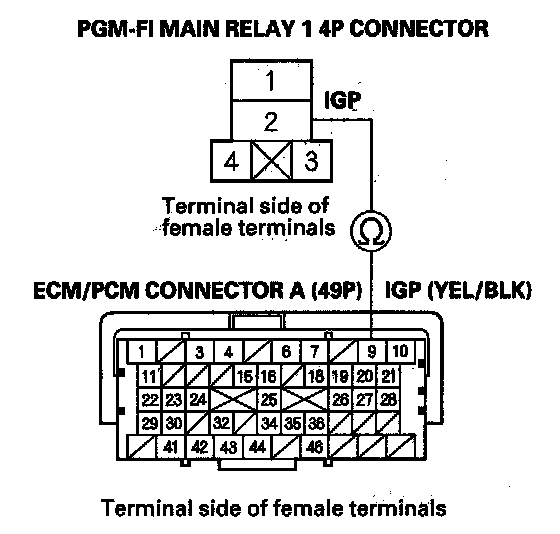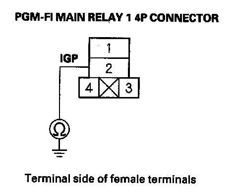 43. Check for continuity between PGM-FI main relay 1 4P connector terminal No. 2 and body ground.
