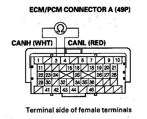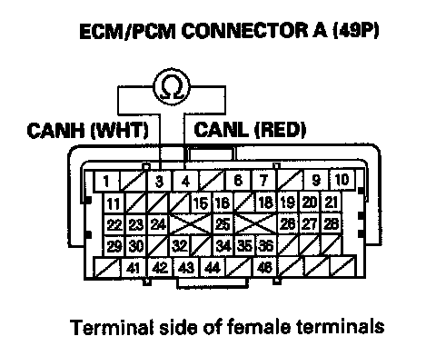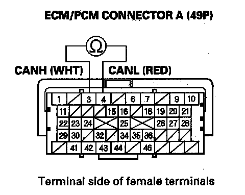 23. Measure resistance between ECM/PCM connector terminals A3 and A4.