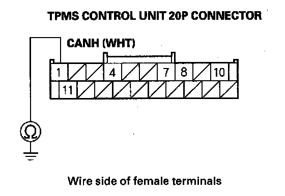 19. Check for continuity between TPMS control unit 20P connector terminal No. 11 and body ground.