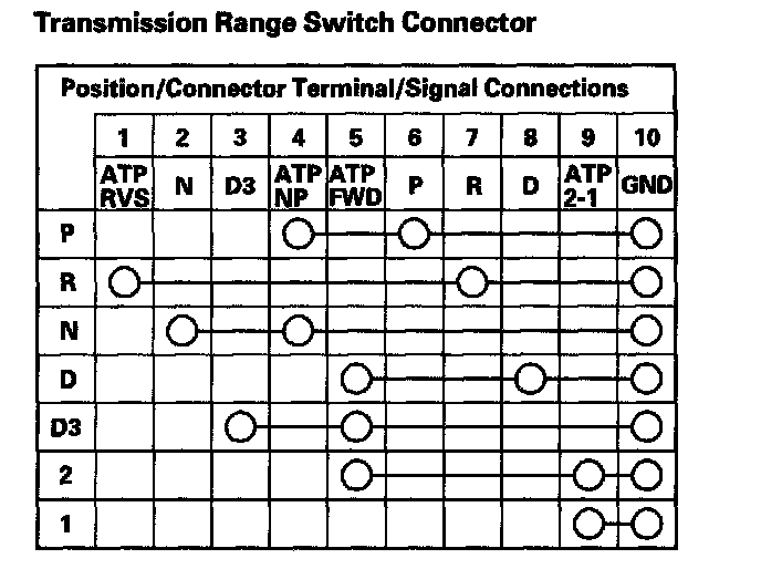8. Check for continuity between the terminals at the transmission range switch connector. There should be continuity between the terminals in the following table for each transmission range switch position.
