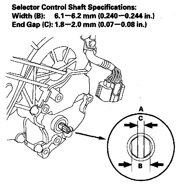 10. Remove the transmission range switch, and check the end of the selector control shaft (A).