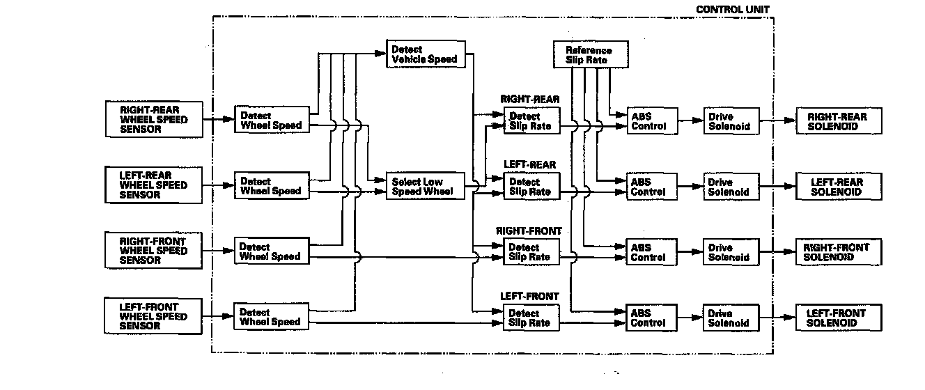 Main ControlThe control unit detects the wheel speed based on the wheel speed sensor signals it receives, then it calculates the vehicle speed based on the detected wheel speed. The control unit detects the vehicle speed during deceleration based on the wheel speeds.