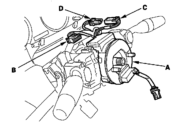 7. Disconnect the dashboard wire harness 4P connector (A) from the cable reel 4P connector (B), then disconnect the dashboard wire harness 20P connector (C) from the cable reel (D).