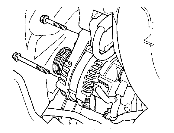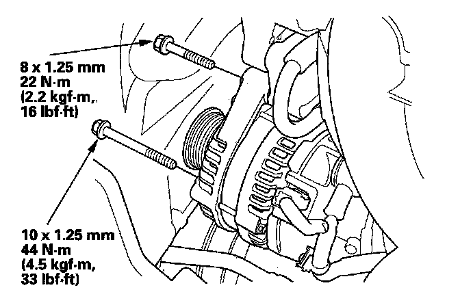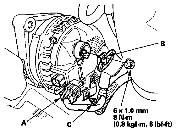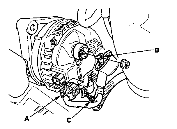 4. Disconnect the alternator connector (A), BLK wire (B), and harness clamp (C) from the alternator, then remove the alternator.