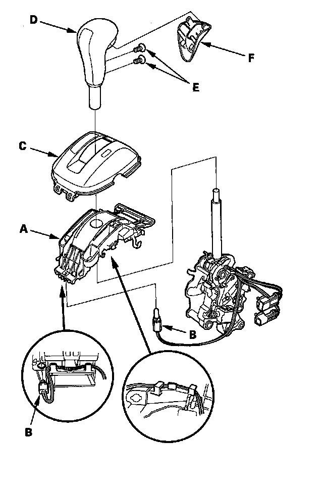 8. Remove the park pin switch/A/T gear position indicator panel light harness (B) and the shift lock solenoid harness (C) from the harness guide (D).