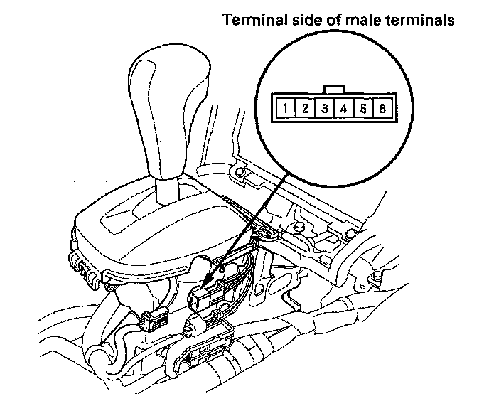4. Shift out of P, and check for continuity between connector terminals No. 1 and No. 2. There should be continuity.