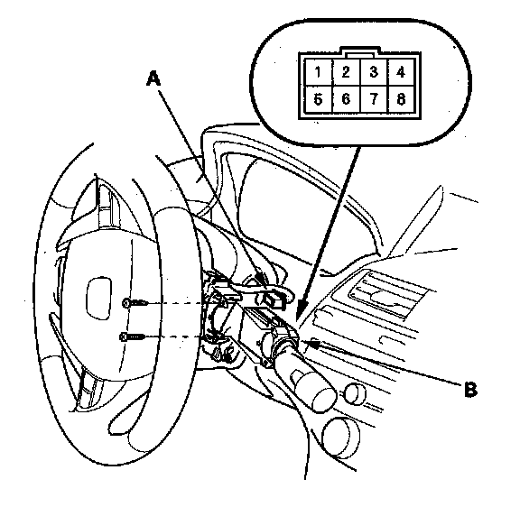 2. Disconnect the dashboard wire harness 8P connector (A) from the wiper/washer switch (B).