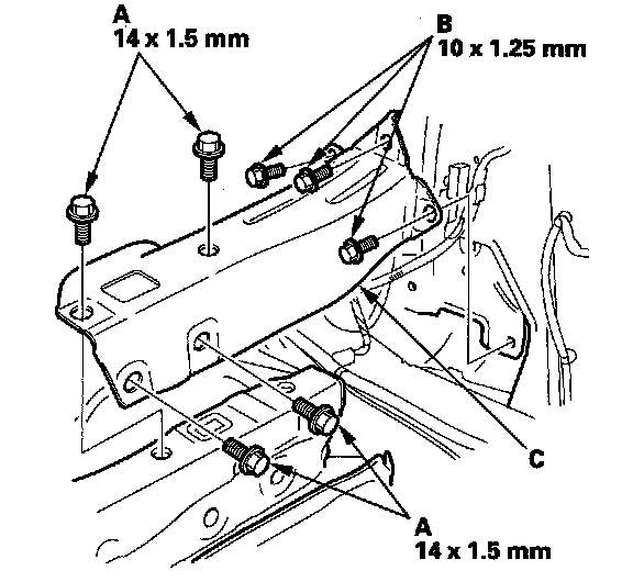 3. Remove the bolts (A, B), then remove the middle cross-member gusset (C).