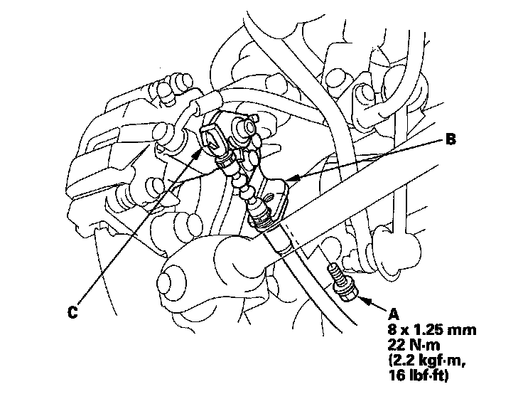 8. Remove the brake caliper bracket mounting bolts (B), and remove the caliper assembly (C) from the knuckle. To prevent damage to the caliper assembly or brake hose, use a short piece of wire to hang the caliper assembly from the undercarriage. Do not twist the brake hose and the parking brake cable excessively.