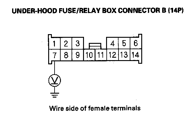 8. Measure the voltage between under-hood fuse/relay box connector terminal B7 and body ground.