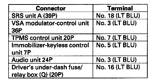 NO - Repair short in the wire between the DLC (K-line) and the VSA modulator-control unit, the SRS unit, the TPMS control unit, the immobilizer-keyless control unit, the audio unit, or the driver's under-dash fuse/relay box.