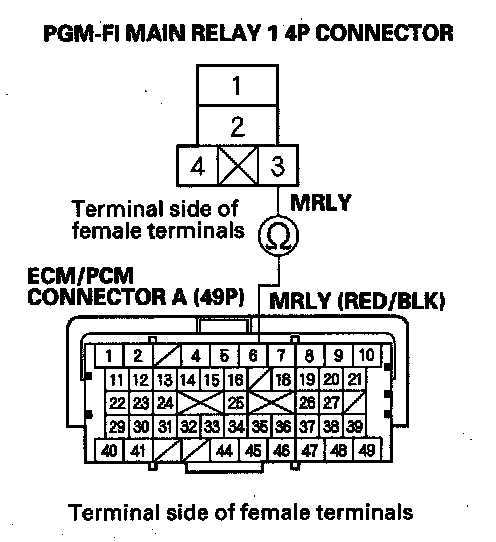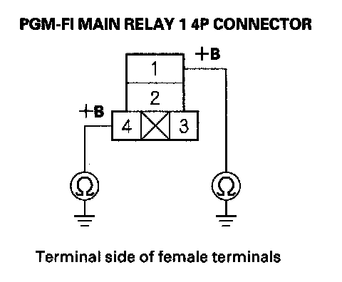 40. Check for continuity between body ground and PGM-FI main relay 1 4P connector terminals No. 1 and No. 4 individually.