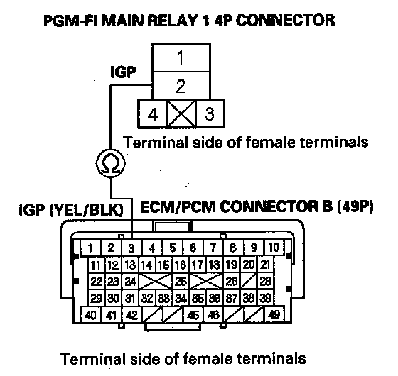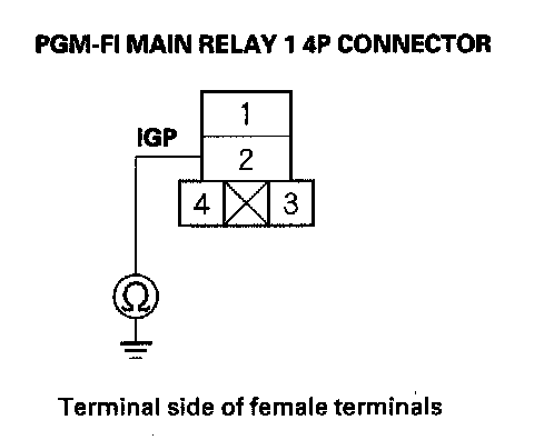 43. Check for continuity between PGM-FI main relay 1 4P connector terminal No. 2 and body ground.