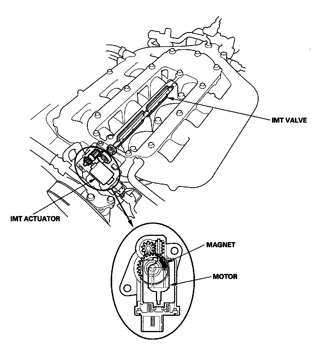 Intake Manifold Tuning (IMT) Valve System (J35Z3 engine)Engine power is adjusted by opening and closing the intake manifold tuning (IMT) valve. When the valve is closed, there is high torque at low engine speed. When the valve is open, there is high torque at high engine speed. The intake manifold tuning (IMT) actuator contains a sensor that detects the IMT valve position and sends it to the ECM/PCM.