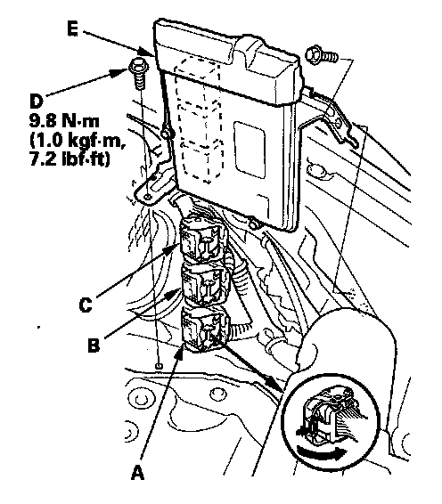 13. Disconnect ECM/PCM connectors A, B, and C, then remove the ECM/PCM assembly (E).