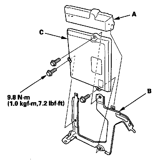 14. Disconnect the cover (A) and the bracket (B) from the ECM/PCM (C).