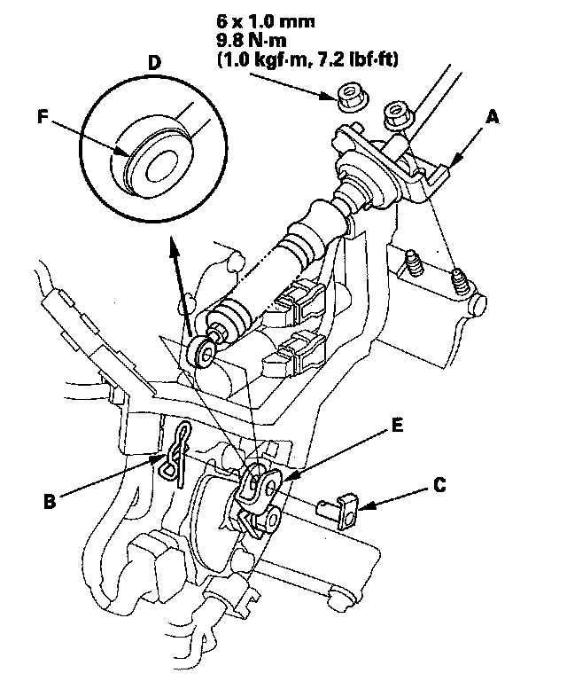 6. Check the bushing (F) in the shift cable end for proper fit and wear. If the bushing is loose or worn, replace the shift cable.