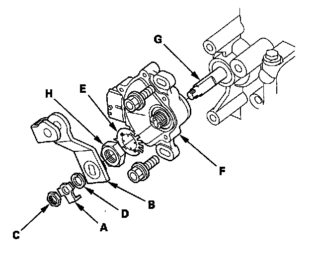 9. Pry the lock tabs of the lock washer (E) on the transmission range switch (F), hold the selector control shaft (G) with a 6.0 mm wrench, and loosen the locknut (H).
