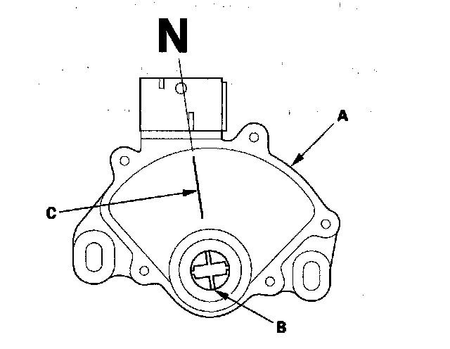 11. Set the new transmission range switch (A) to the N position. The transmission range switch clicks in the N position, and the control shaft hole (B) aligns with the N position line (C).