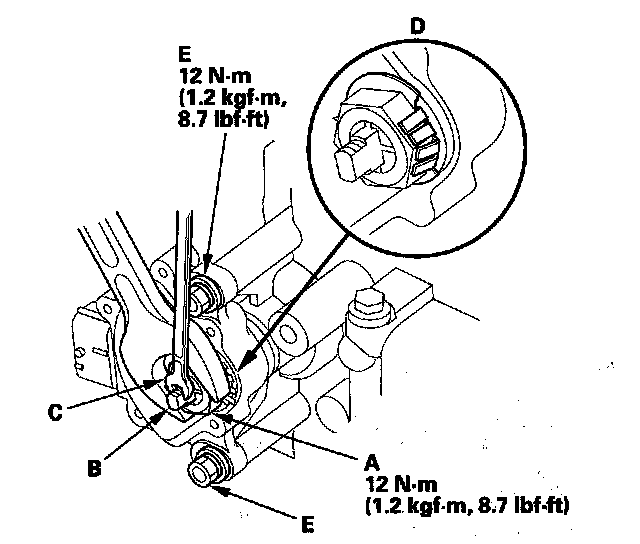 16. Tighten the bolts (E) securing the transmission range switch to 12 N-m (1.2 kgf-m, 8.7 lbf-ft).