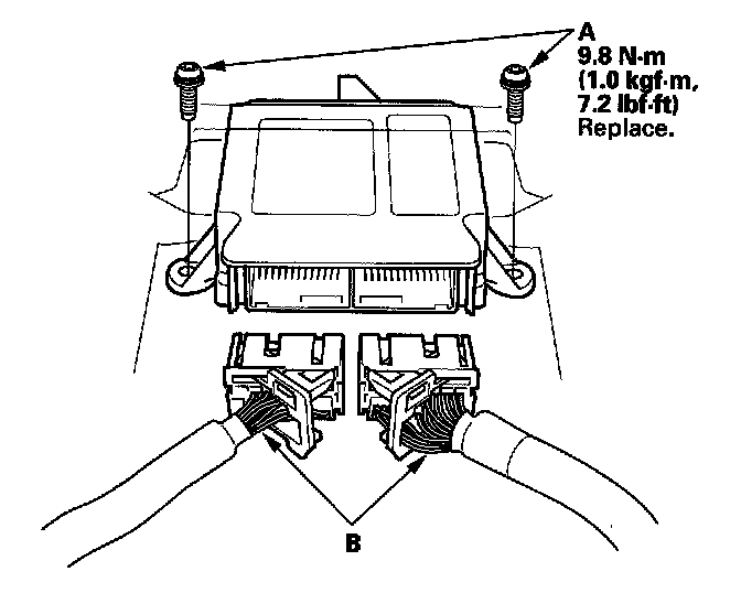 2. Using a TORX T30 bit, install the new TORX bolts (A), then connect the connectors (B) to the SRS unit; push them into position until they click.