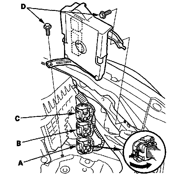 9. Disconnect PCM connectors A, B, and C, then remove the PCM.