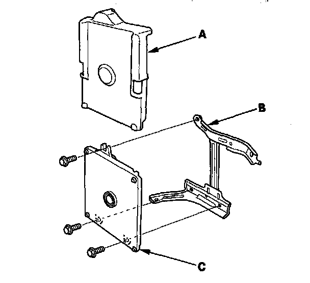 10. Remove the cover (A) and the bracket (B) from the PCM (C).