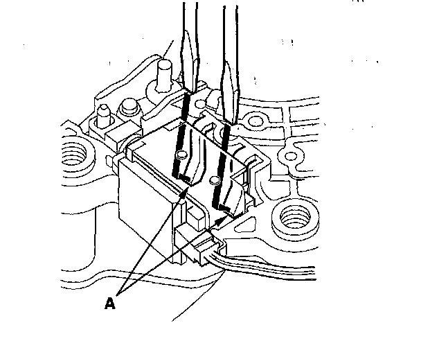 2. Release the lock tabs (A) retaining the shift lock solenoid using thin-bladed screwdrivers.