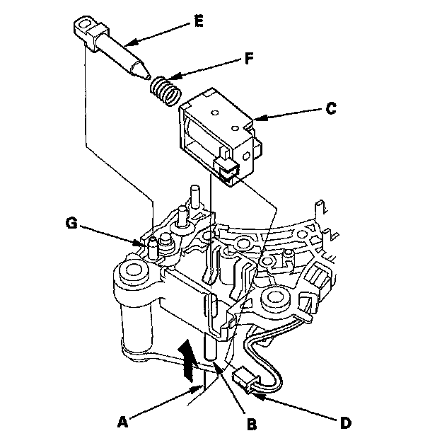 5. Replace the shift lock solenoid, the solenoid plunger (E), and the plunger spring (F) assembly.