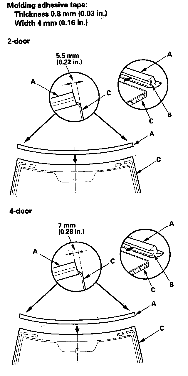 14. Attach the molding (A) with adhesive tape (B) to the upper edge of the windshield (C). Be careful not to touch the windshield where adhesive will be applied.