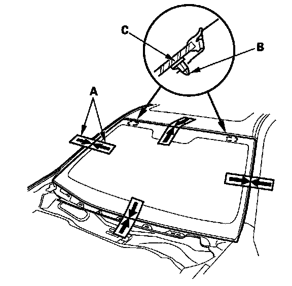 12. Attach the rubber dam A, and the upper clips (B) with adhesive tape to the inside face of the windshield (C) as shown. Before installing the upper clips, apply primer to the area where the adhesive tape will be applied to the inside face of the windshield: