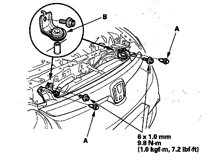10. Disconnect the hood latch switch connector (A), then remove the mounting bolts (B) and the clamps (C).