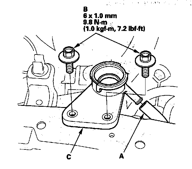 14. Disconnect the upper radiator hose (A) and the lower radiator hose (B), then remove the water lower pipe mounting bolts (C).