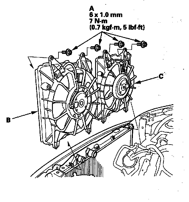 21. Remove the mounting bolts (A), then pull up the radiator fan shroud assembly (B) and the A/C condenser fan shroud assembly (C).