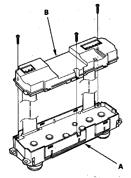 3. Remove the self-tapping screws, then carefully separate the climate control unit display (A) from the control unit (B). Do not kink or pull on the wires between the display and the control panel. Do not touch the electronic components on the printed circuit board in the control panel.