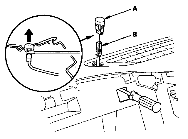 2. Remove the sunlight sensor (A) from the dashboard with a flat-tip screwdriver, then disconnect the connector (B). Be careful not to damage the sensor and the dashboard.