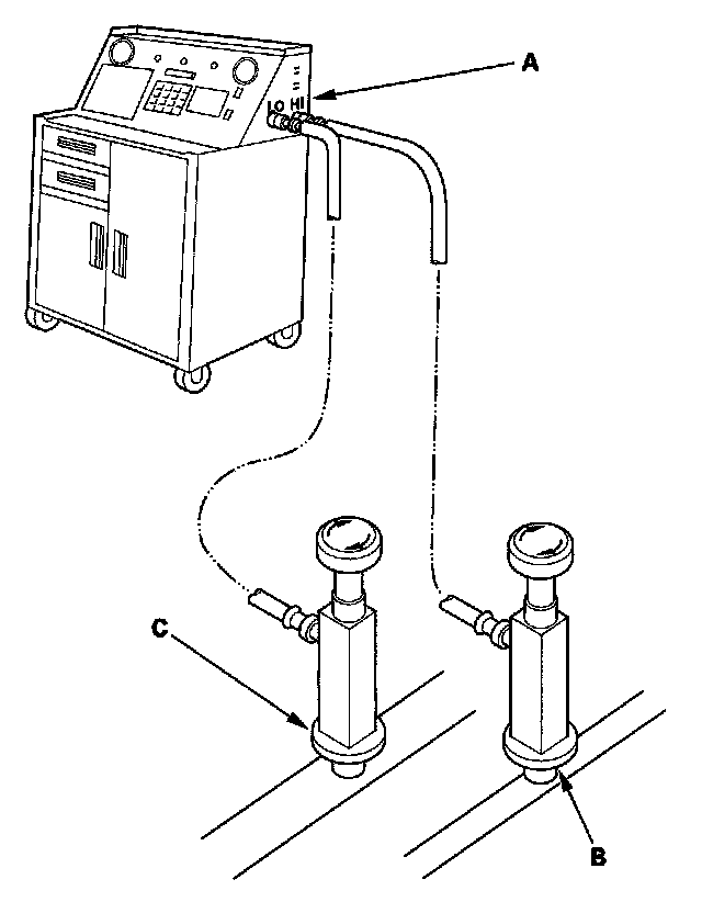 1. Connect an R-134a refrigerant recovery/recycling/charging station (A) to the high-pressure service port (B) and the low-pressure service port (C), as shown, following the equipment manufacturer's instructions.